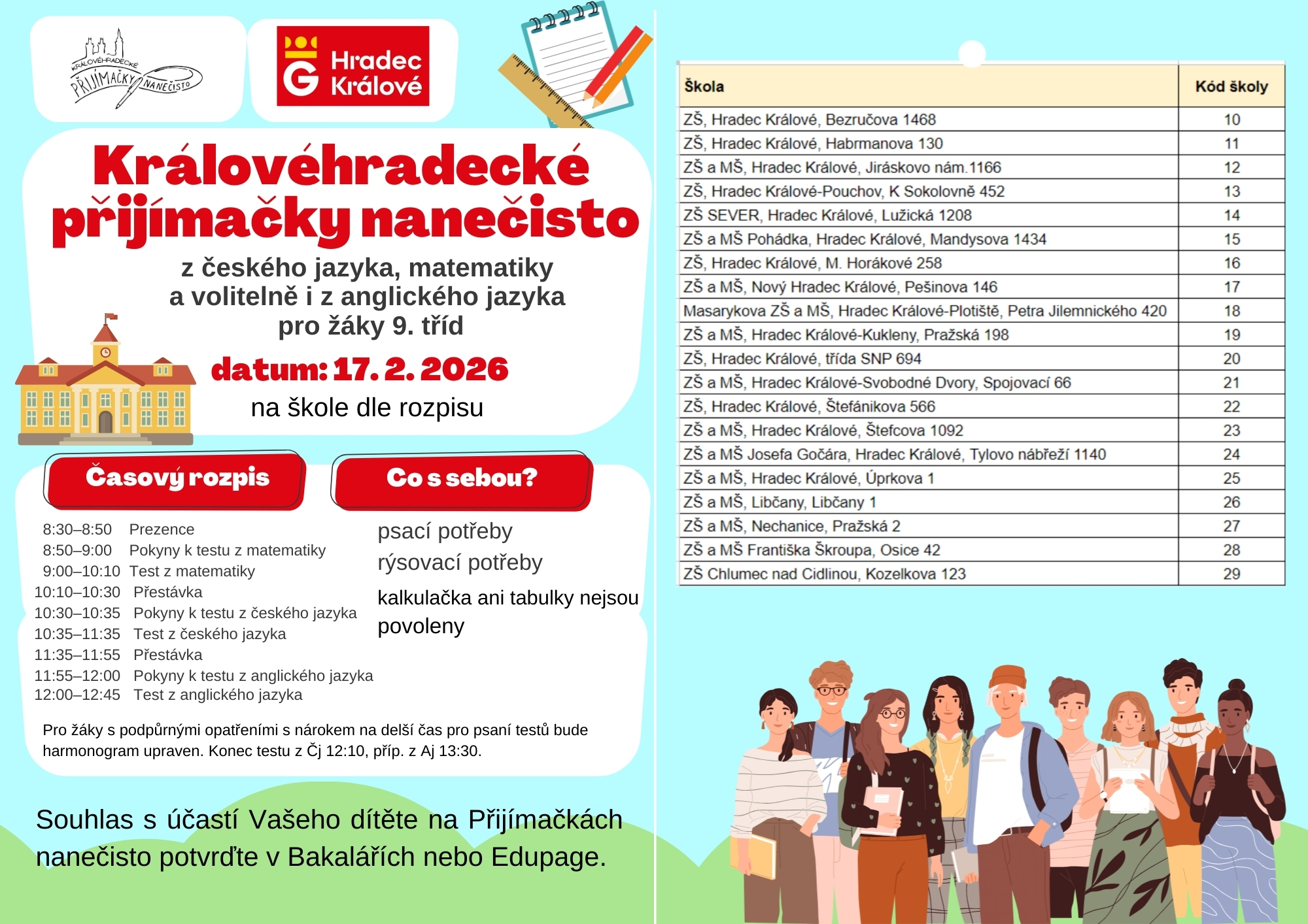 Přijímačky nanečisto se uskuteční v úterý 17. února 2026 na jednotlivých základních školách dle rozpisu.