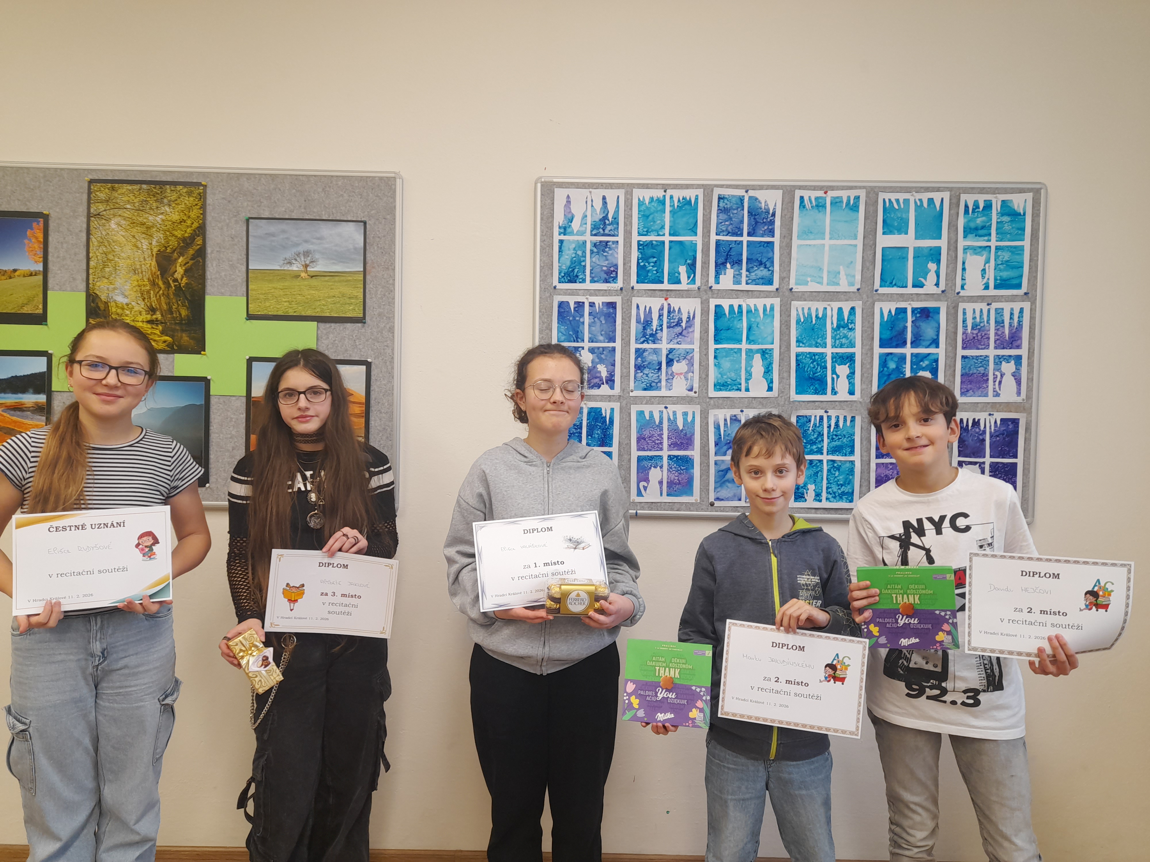 Ve středu 11.února proběhlo na druhém stupni školní kolo recitační soutěže. V mladší kategorii 6.-7. tříd se na 3. místě umístila Alžběta Jaklová (7.A), o druhé místo se dělí David Hejč a Marek Jakubínský (oba 6.C) a 1. místo patří Elišce Valáškové (7.B). Ve starší kategorii 8.-9. tříd skončila na 3. místě Viktorie Horáková (9.A) společně s Ivanou Kozubovou (9.B), druhou příčku obsadila Aneta Mojžíšová (8.A) a vítězkou se stala Lucie Matyášová (9.C). Čestná uznání od poroty získaly Eliška Rudyšová (6.B) a Laura Chýlková (9.B).
